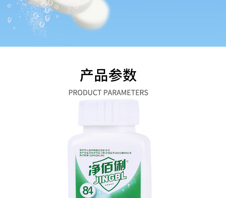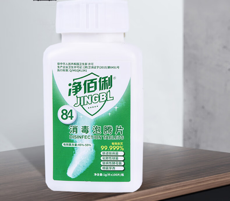 商品名称:净佰俐 (JINGBL)84消毒液泡腾片1g*100片*100瓶 含氯消毒剂(新老包装随机) 单位:箱