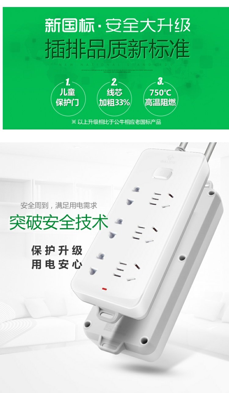 公牛 插座插排插线板插板带线4/6/8/10插位家用多孔转换器3/5/10米 GN-403