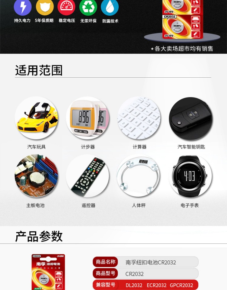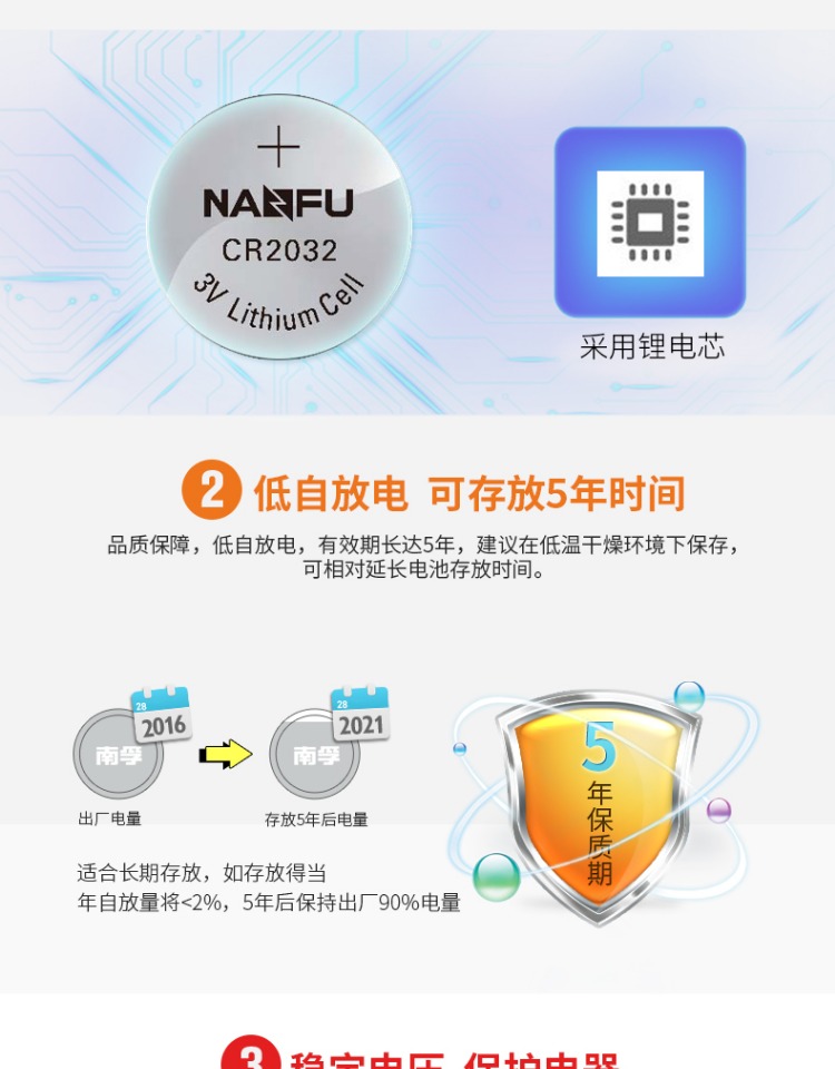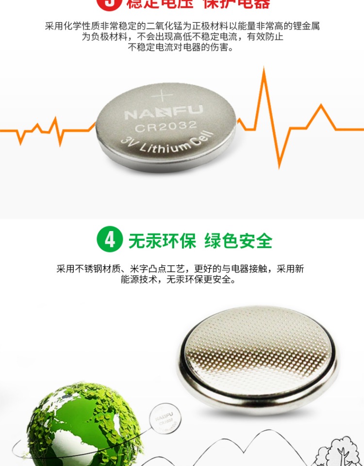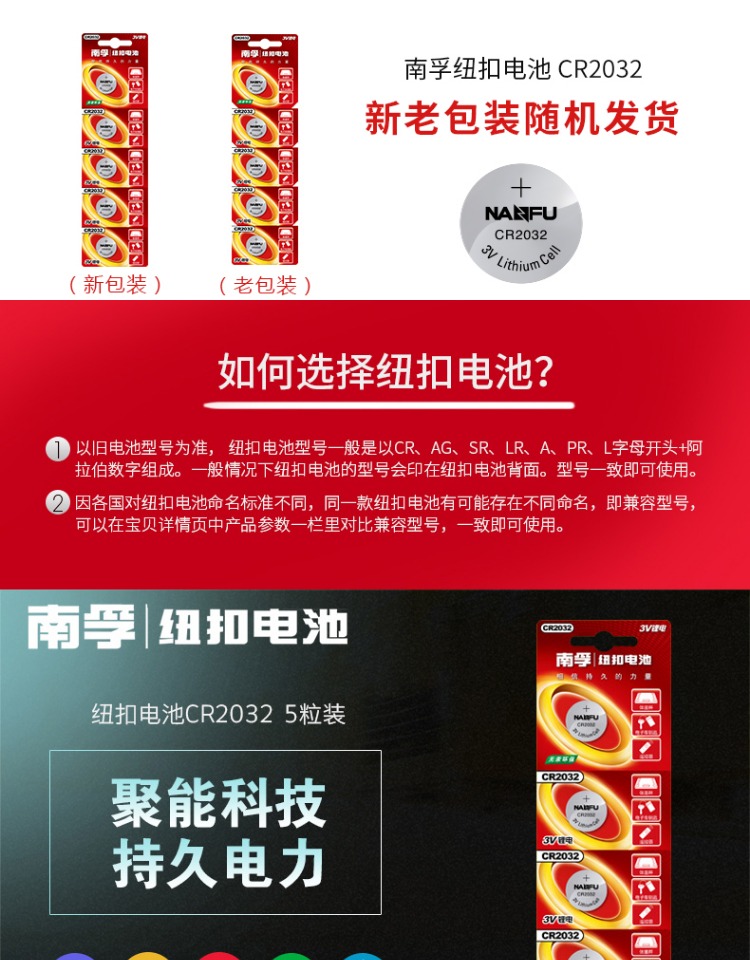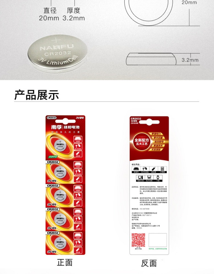 商品名称:南孚 纽扣电池锂电池3V 5五粒 CR2032