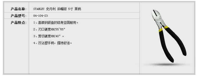 商品名称:STANLEY/史丹利 黑色双塑柄斜嘴钳5” 84-104-23