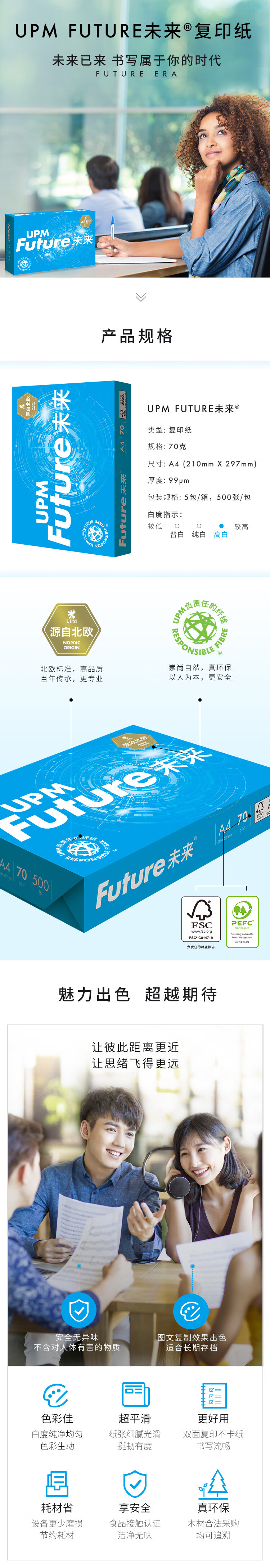 商品名称:UPM蓝未来 70g A4打印纸 复印纸 高白度 500张/包 5包/箱(2500张)