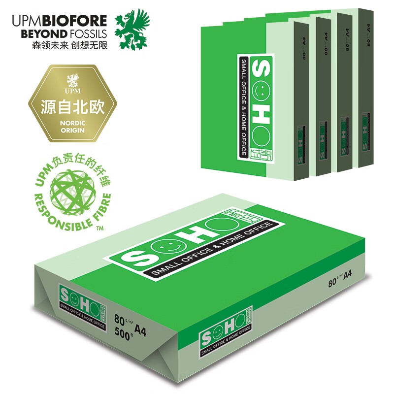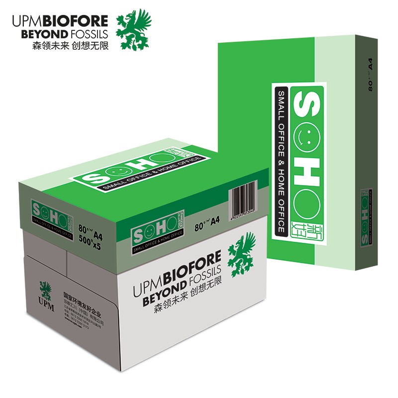 商品名称:UPM绿新好 80g A4打印纸 复印纸 加厚款 500张/包 5包/箱(2500张) 单位:箱