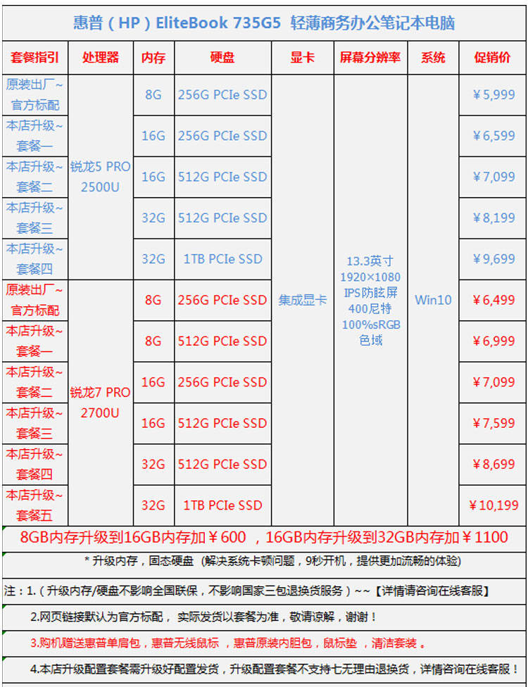 商品名称:惠普/HP EliteBook 13.3英寸轻薄笔记本电脑(锐龙5 PRO 2500U/锐龙7 PRO 2700U 100%sRGB一年上门 735G5