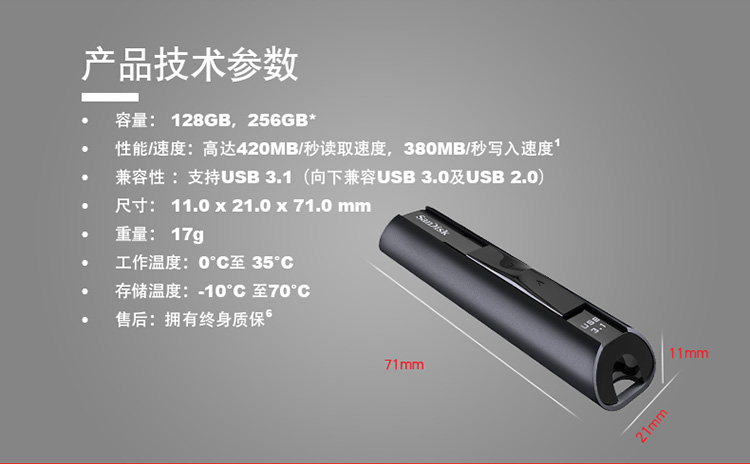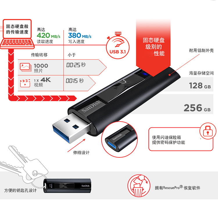 商品名称:闪迪 128G USB3.1固态闪存盘读420M/S 加密U盘 CZ880