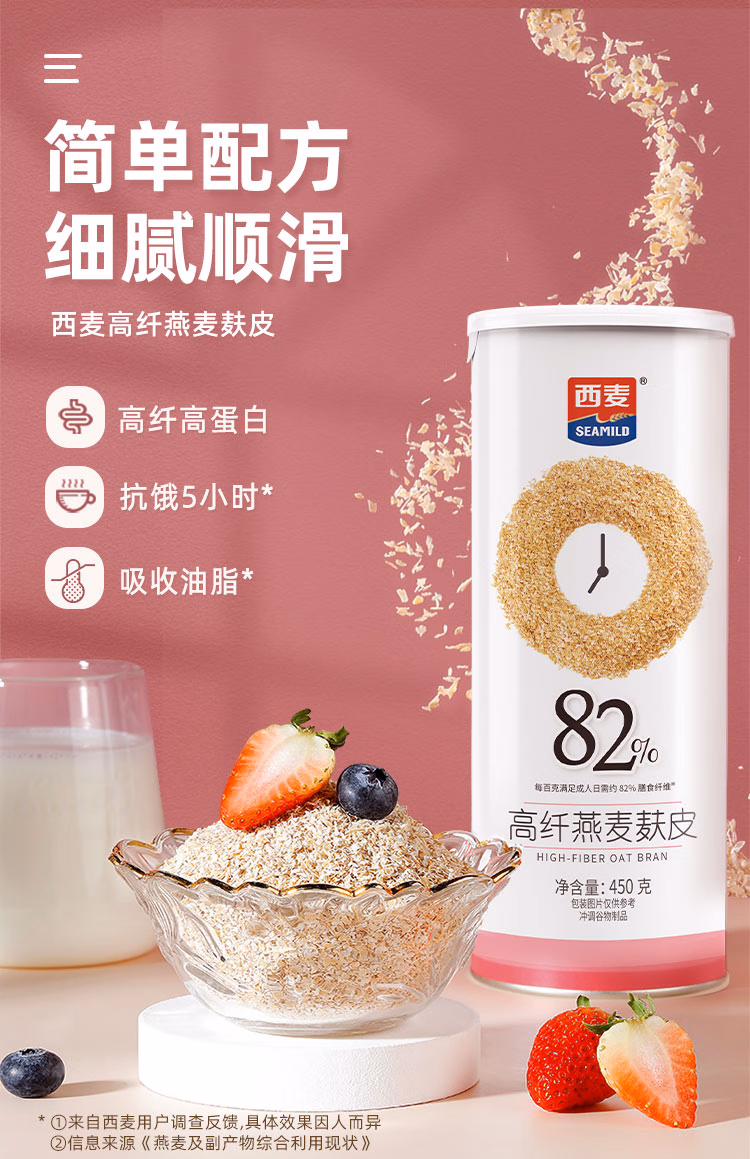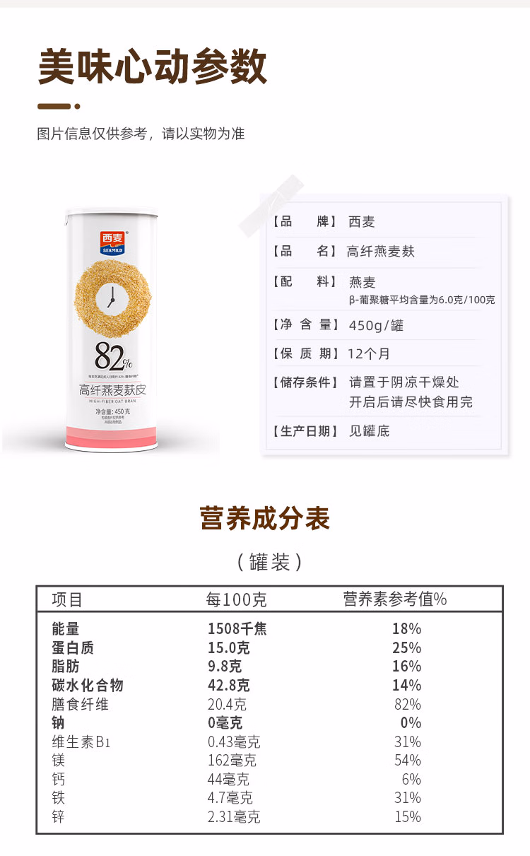 商品名称:西麦高纤燕麦麸皮450g罐 燕麦片低GI营养代餐无额外添加蔗糖膳食纤维 单位:罐