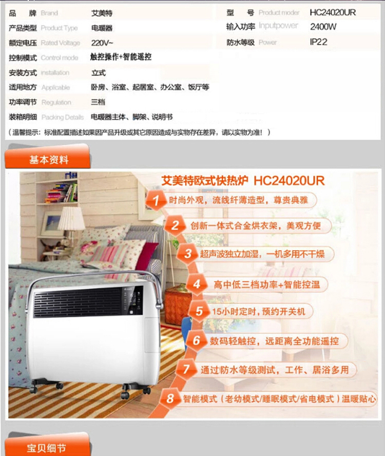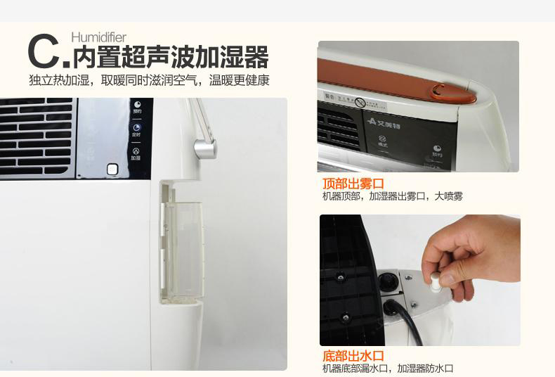 商品名称:艾美特 取暖器家用电暖器智能遥控静音喷雾加湿 HC24020UR