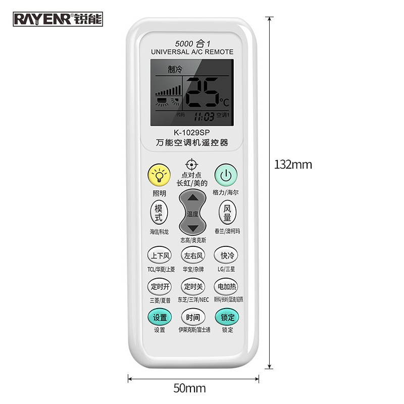 商品名称:锐能 RAYENR万能空调遥控器多用遥控开关通用格力美的海尔海信科龙奥克斯松下志高三菱日立NR0144 单位:个