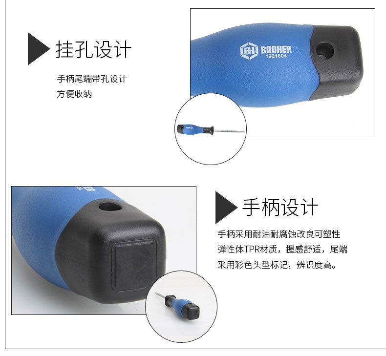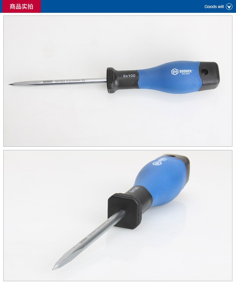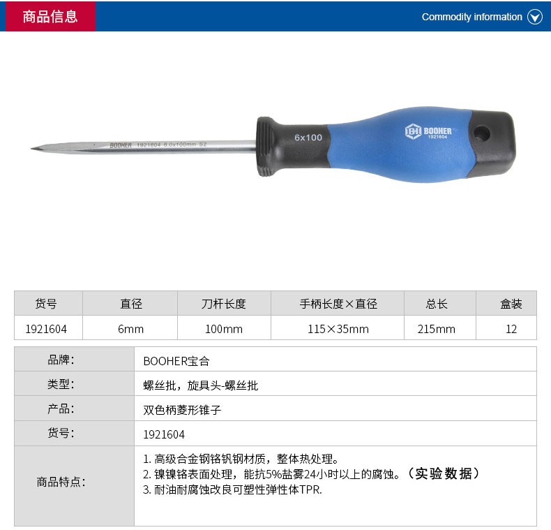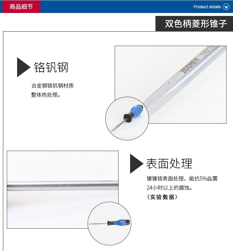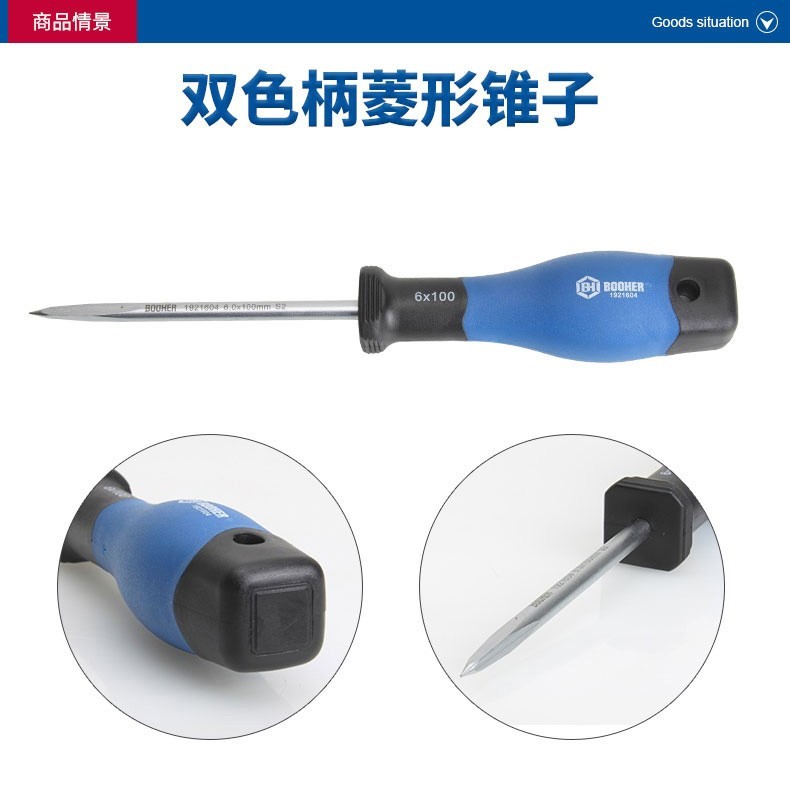 商品名称:Booher宝合工具 BH1921604 双色柄菱形锥子6.0x100mm 编号 1921604 单位:把
