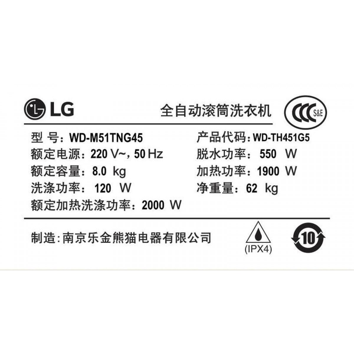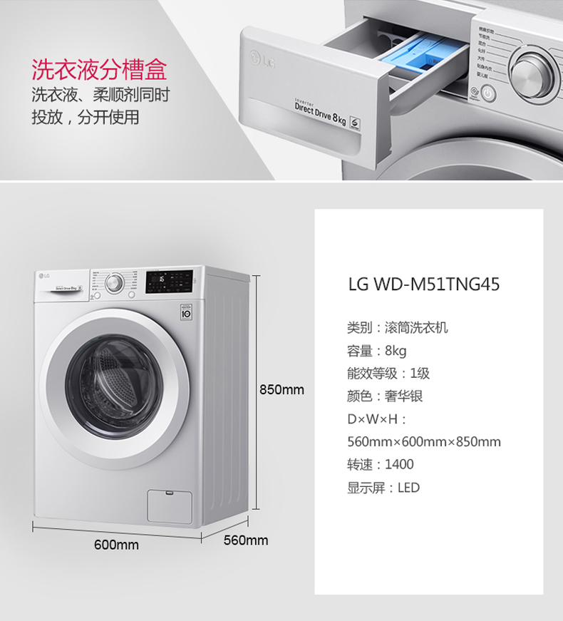商品名称:LG 8公斤滚筒洗衣机全自动 WD-M51TNG45