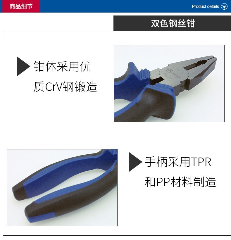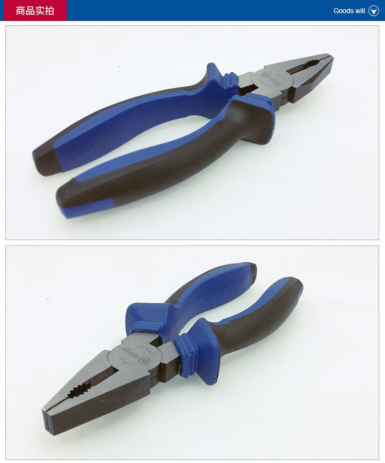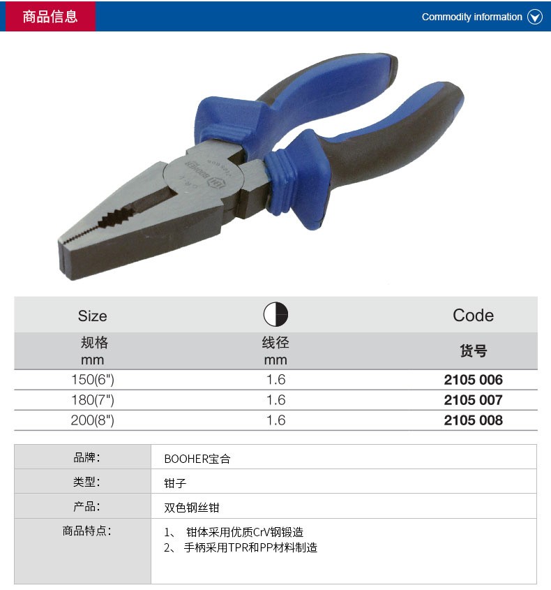 商品名称:Booher宝合手动工具 双色CrV钢丝钳BH2105006/07/08 6"~8"可选 BH2105006 150mm(6英寸) 单位:把