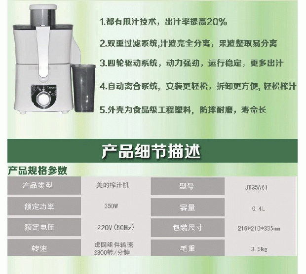 商品名称:美的 全自动果蔬渣分离水果小型炸果汁 JM353