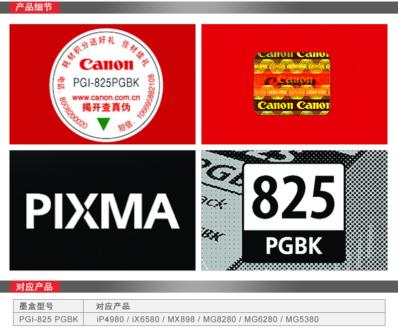 商品名称:佳能/Canon PGI-825 BK墨盒(适用IP4880IX6580MG8180 6180 MX898)