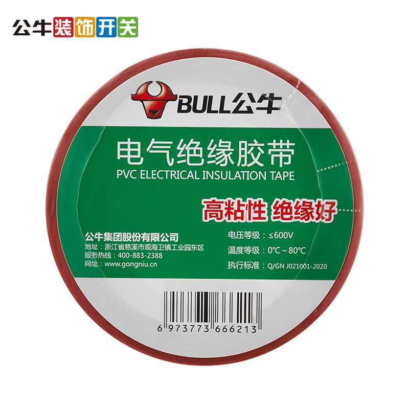 公牛 电工胶布电气绝缘电工胶带PVC防水胶布18米红色胶带 单位:卷