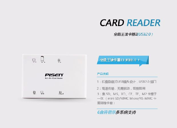 商品名称:Pisen/品胜 多功能读卡器TF SDHC CF MS读卡器 USB2.0读卡机