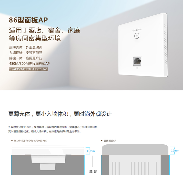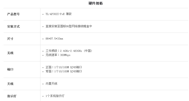 商品名称:TP-LINK TL-AP302I-POE 86型无线面板AP WIFI覆盖POE供电