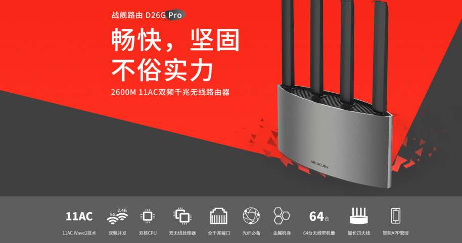 商品名称:水星 D26G Pro 双频2600M千兆端口无线路由器家用5G光纤穿墙WiFi