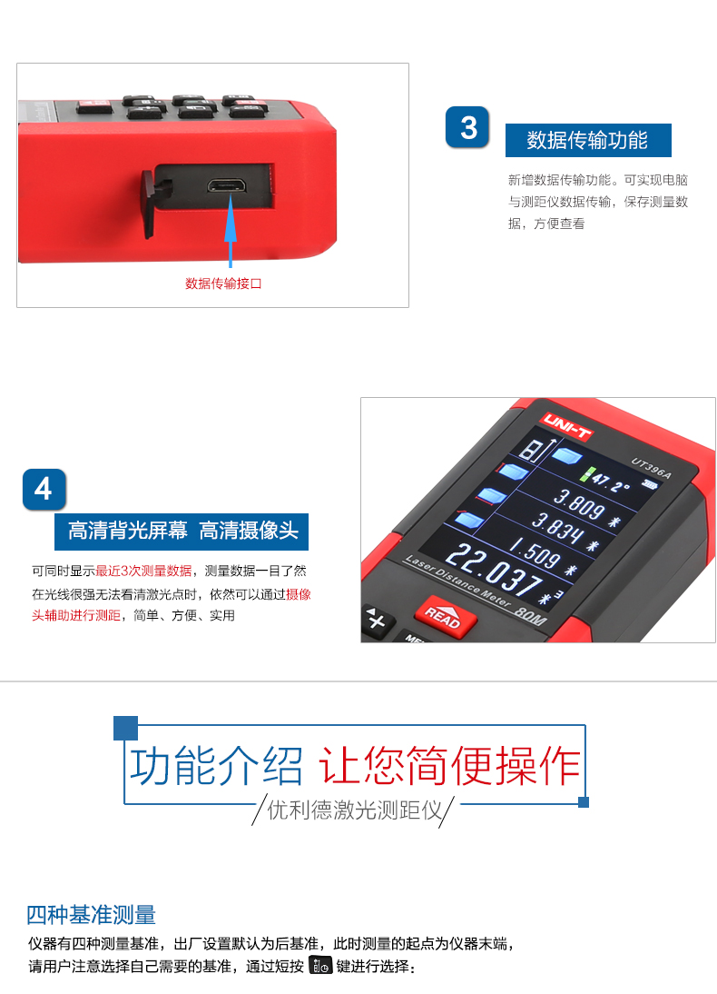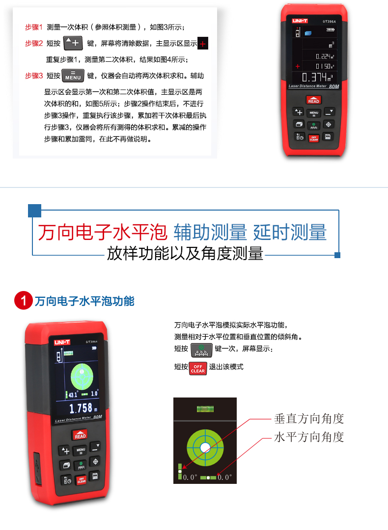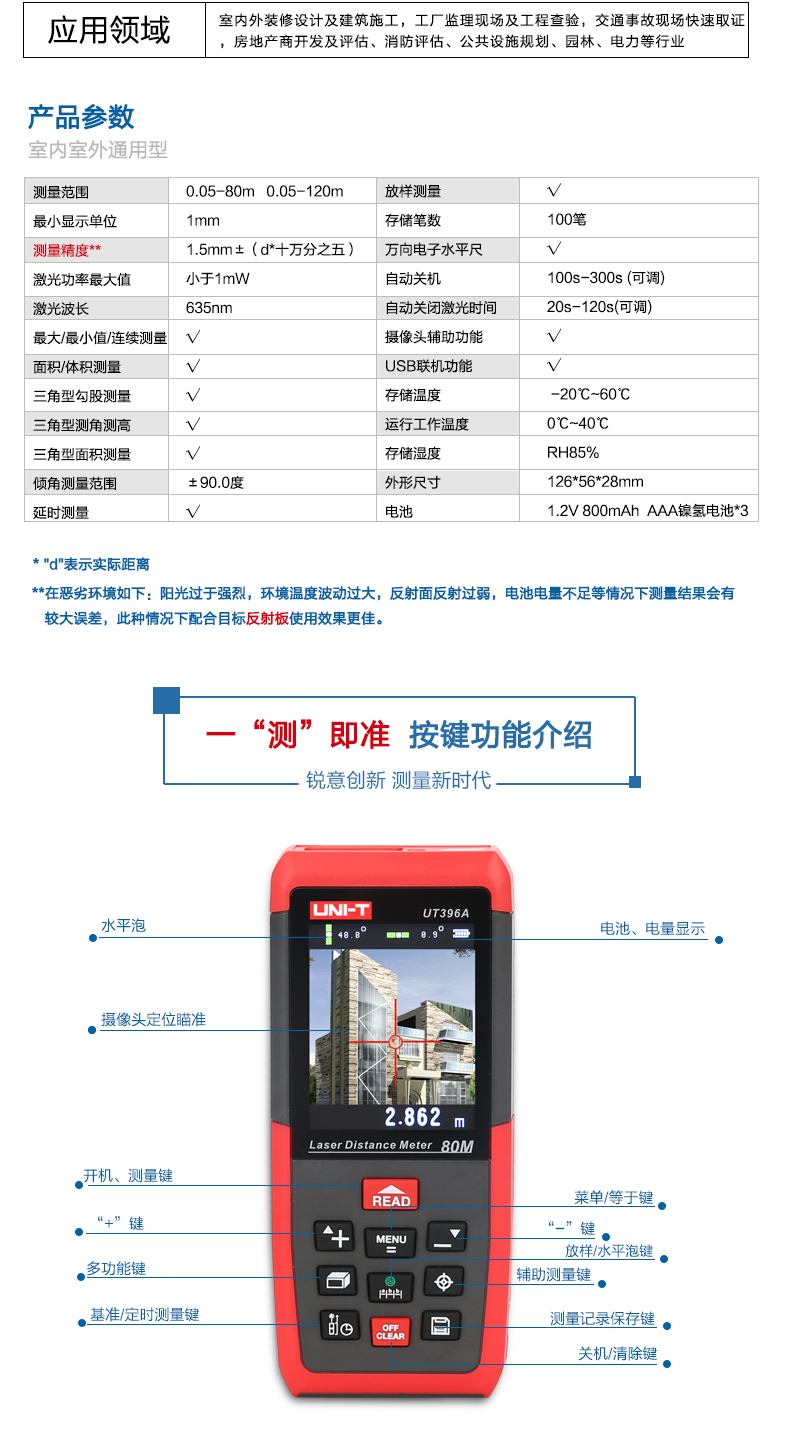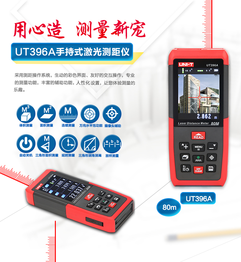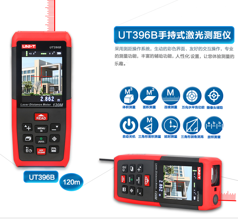 商品名称:优利德 彩屏激光测距仪 80米摄像头 120米测距电子尺 UT396A/B