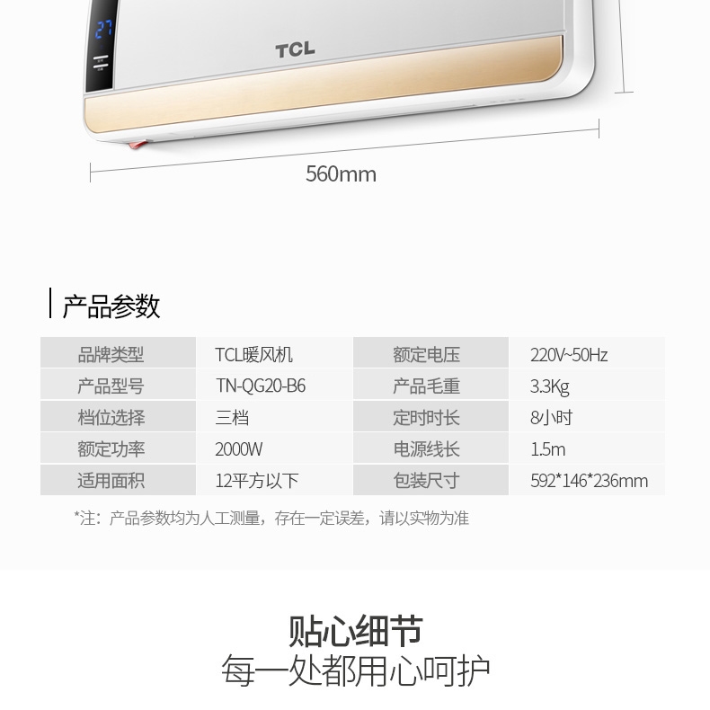 商品名称:TCL 取暖器防水暖风机电暖气壁挂速热 TN-QG20-B6