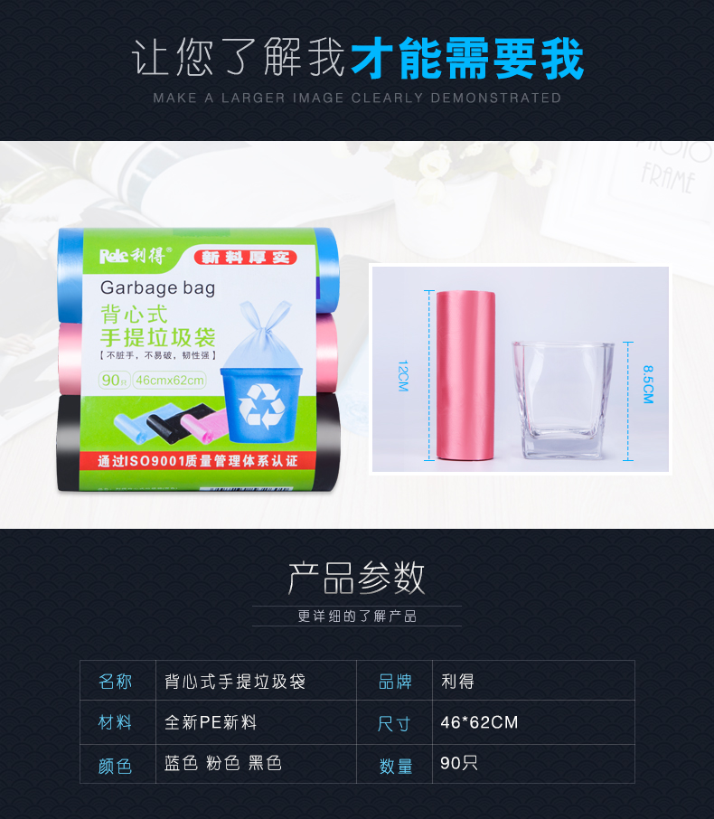 商品名称:利得 垃圾袋加厚手提背心式46*62*3卷用直径28cm桶