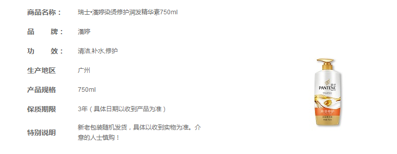 商品名称:潘婷 护发素 染烫修护润发精华素750ml损伤修复