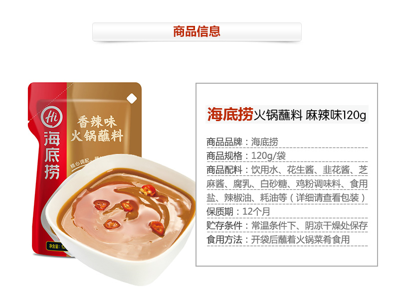 商品名称:海底捞 火锅蘸料香辣味120g*5 芝麻酱花生酱捞派调味料