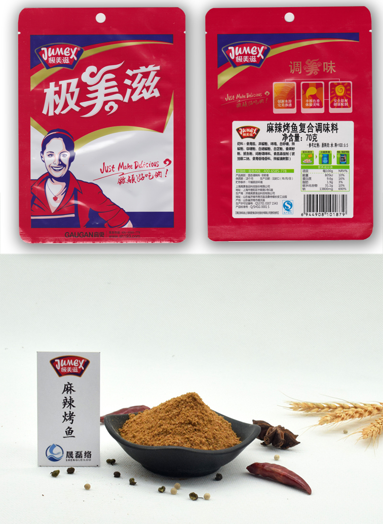 商品名称:极美滋 麻辣烤鱼味70g 烧烤调料 烤鱼料