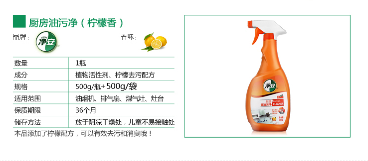 商品名称:Cleafe/净安 厨房油污净500ml/瓶+500ml/袋油烟机清洁剂