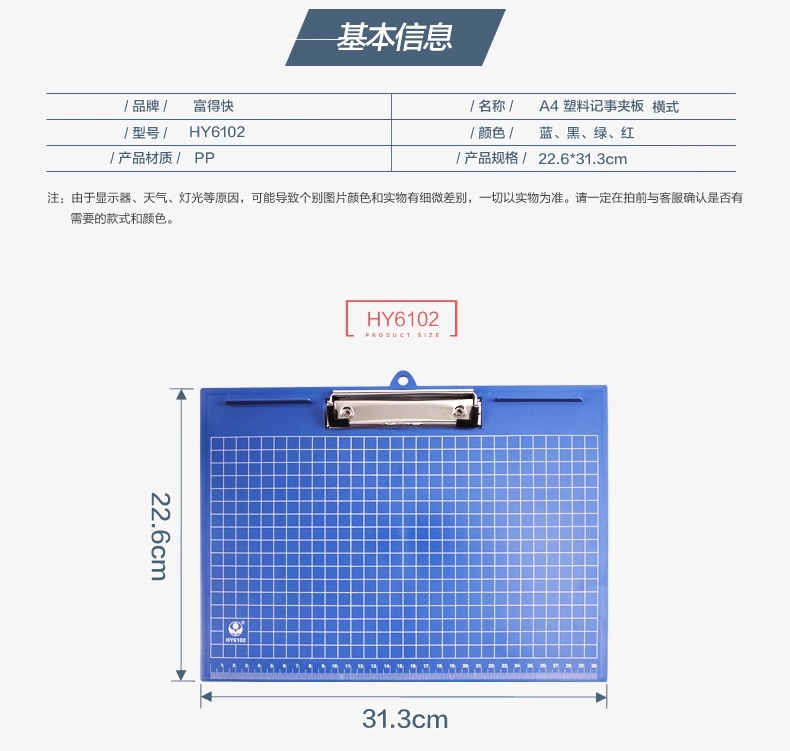 商品名称:富得快 横款垫板夹写字板夹菜单夹书写垫字板 A4横款文件夹板 塑料塑料记事板夹板 横板夹学生画板 书写画夹