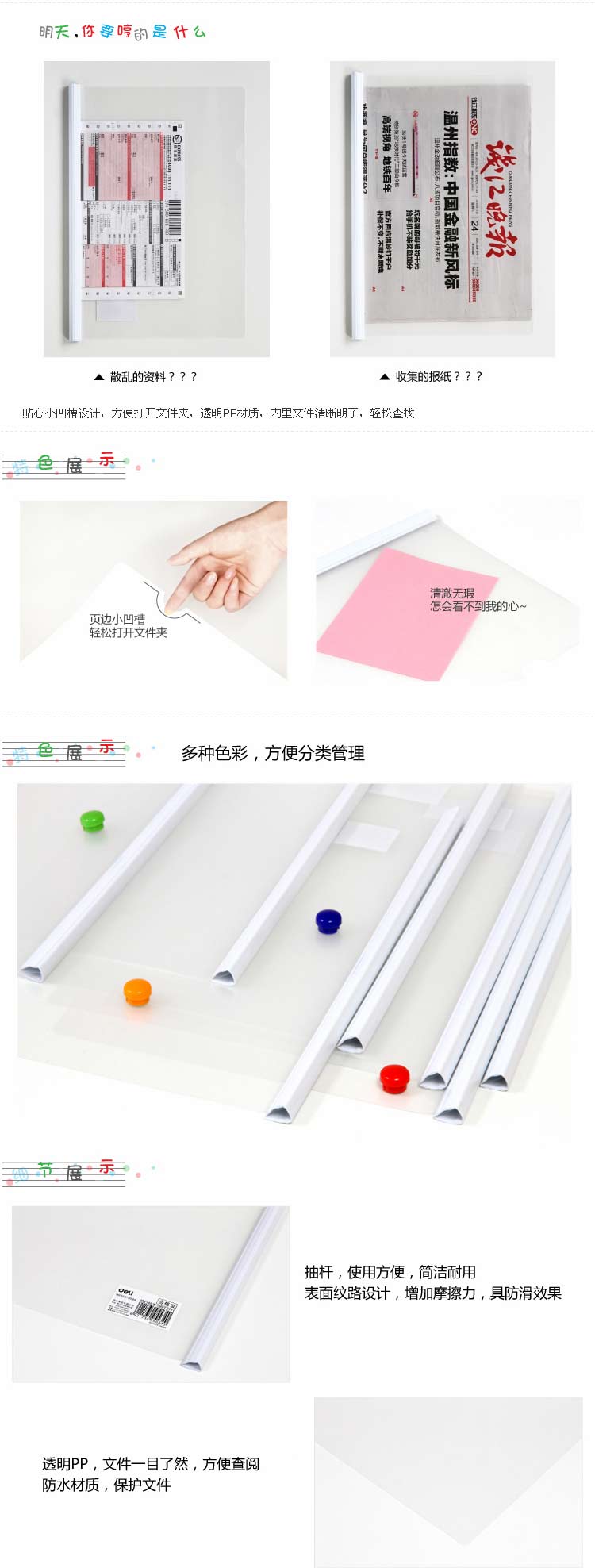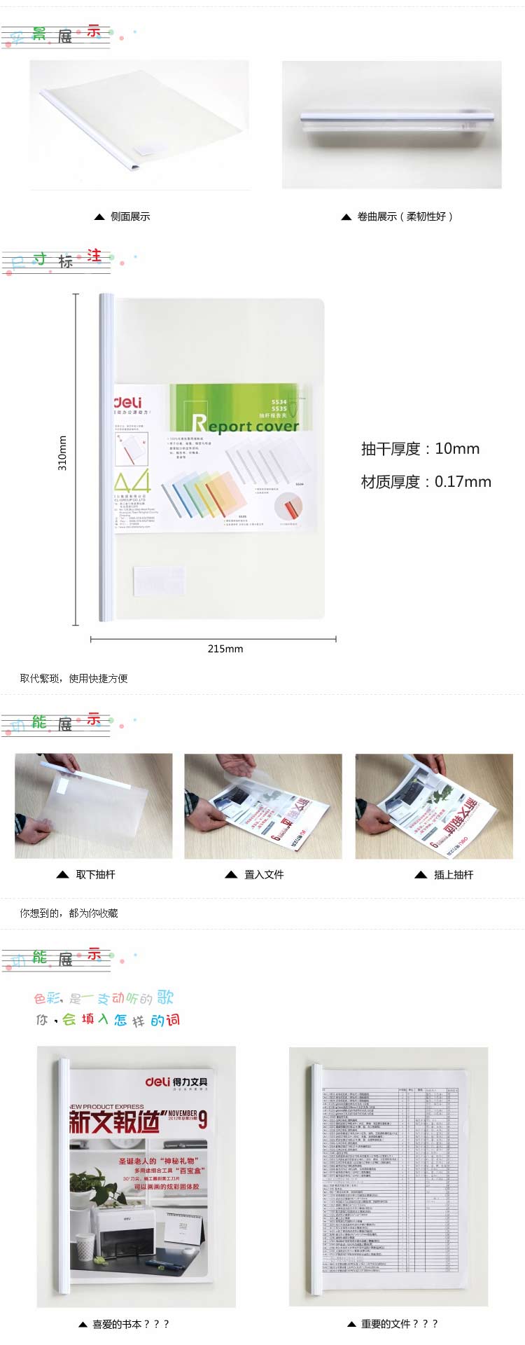 商品名称:得力 抽杆夹拉杆文件夹报告夹A4透明文件夹 5534