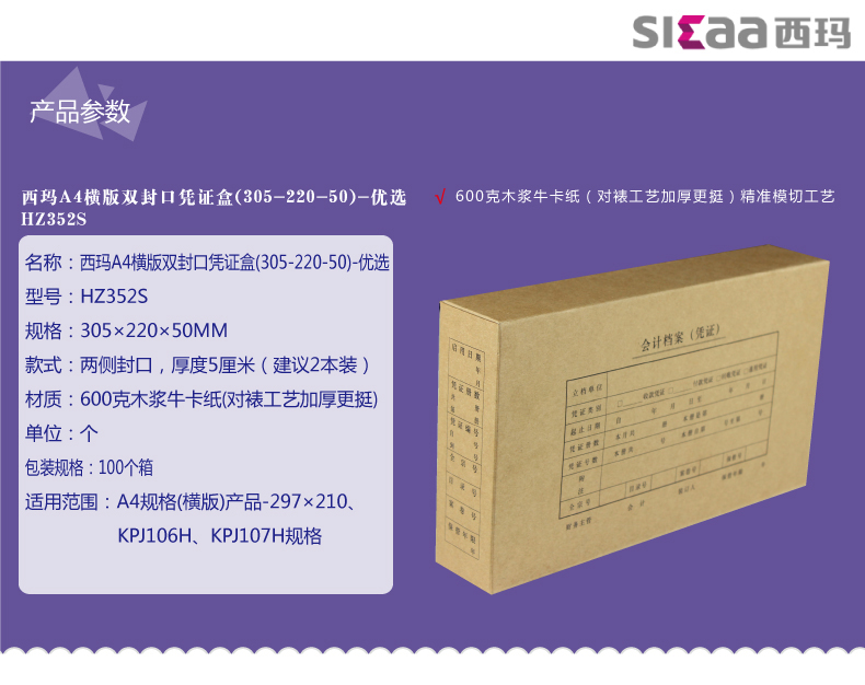 商品名称:西玛 全A4凭证装订盒档案盒 双封口横版凭证盒305*220*50mm会计档案盒装订盒子空白凭证纸报销单据通用 HZ352S