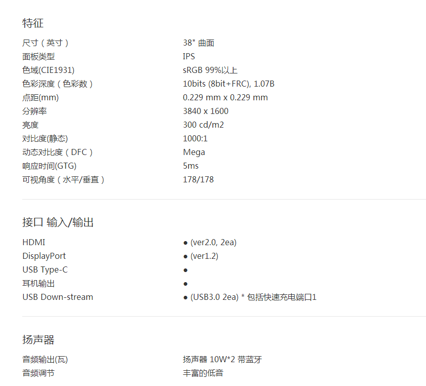 商品名称:LG 38寸IPS超高清曲面专业显示器音响 38UC99-W