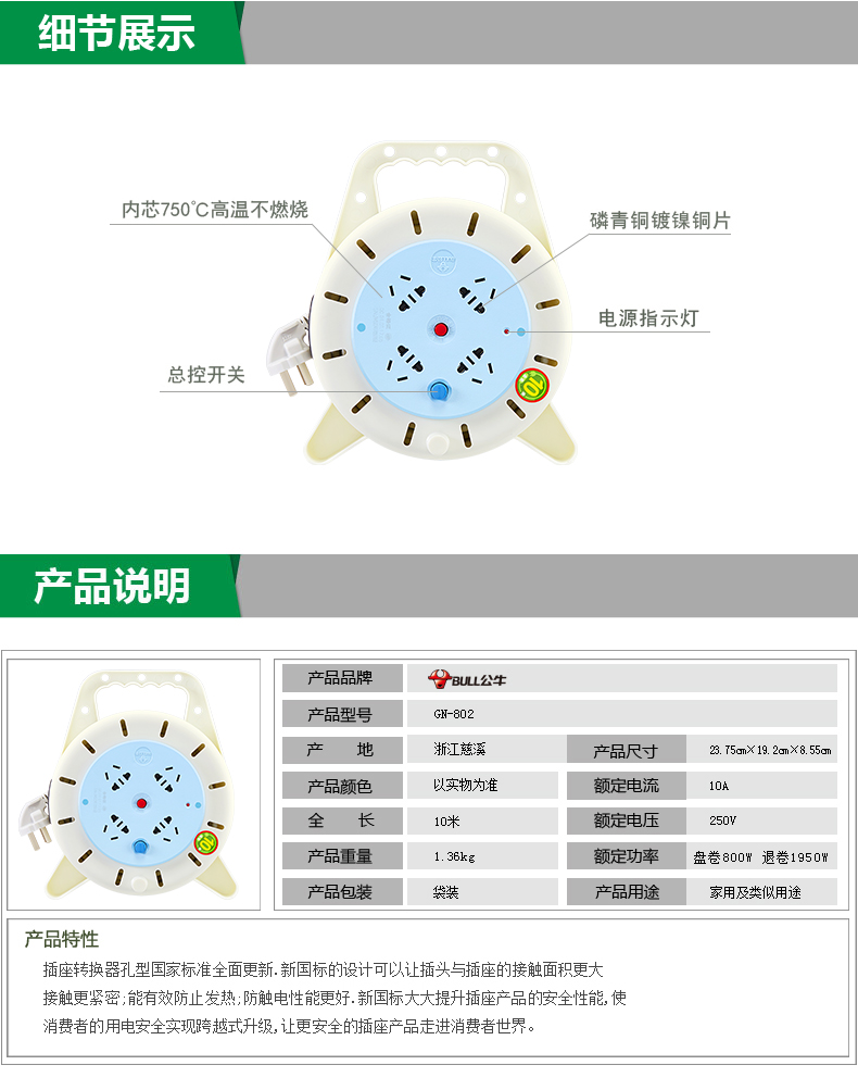 商品名称:公牛 插座卷线盘线轴拖线盘GN-802移动式电缆卷盘线盘10米