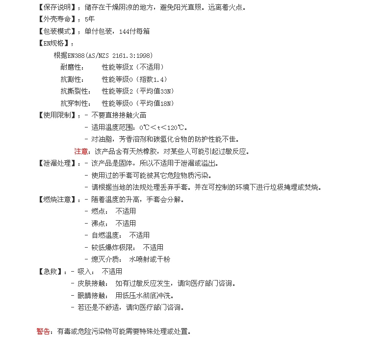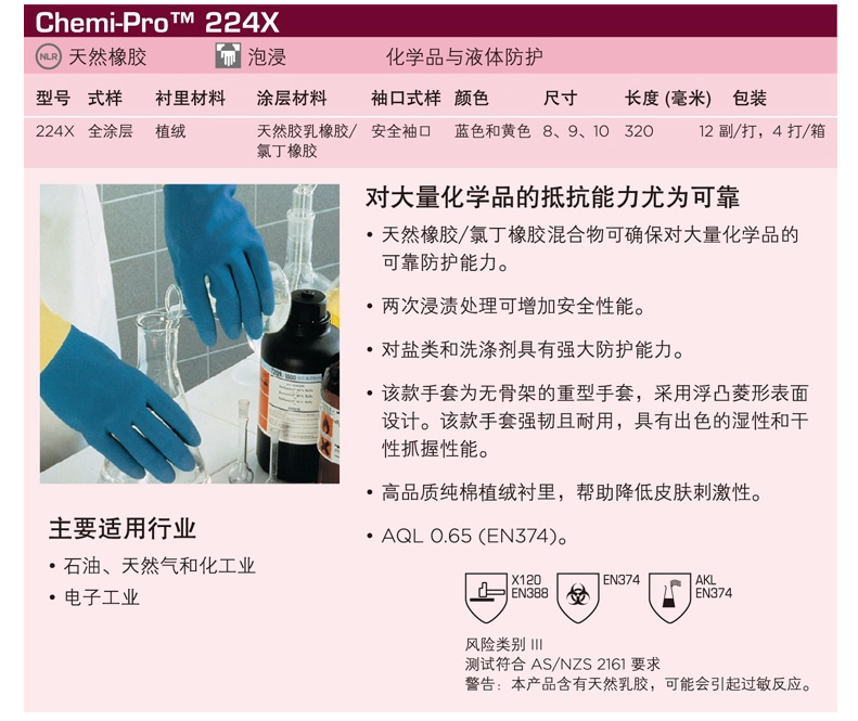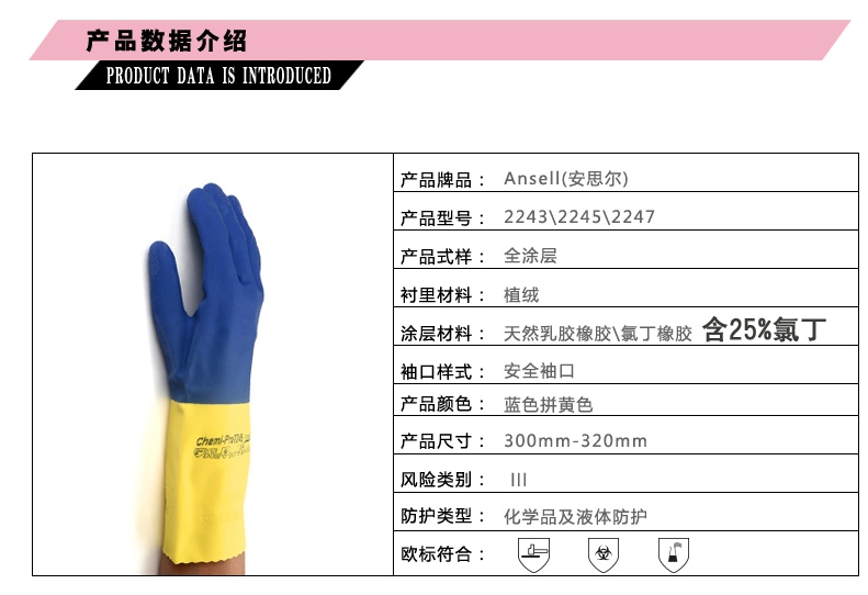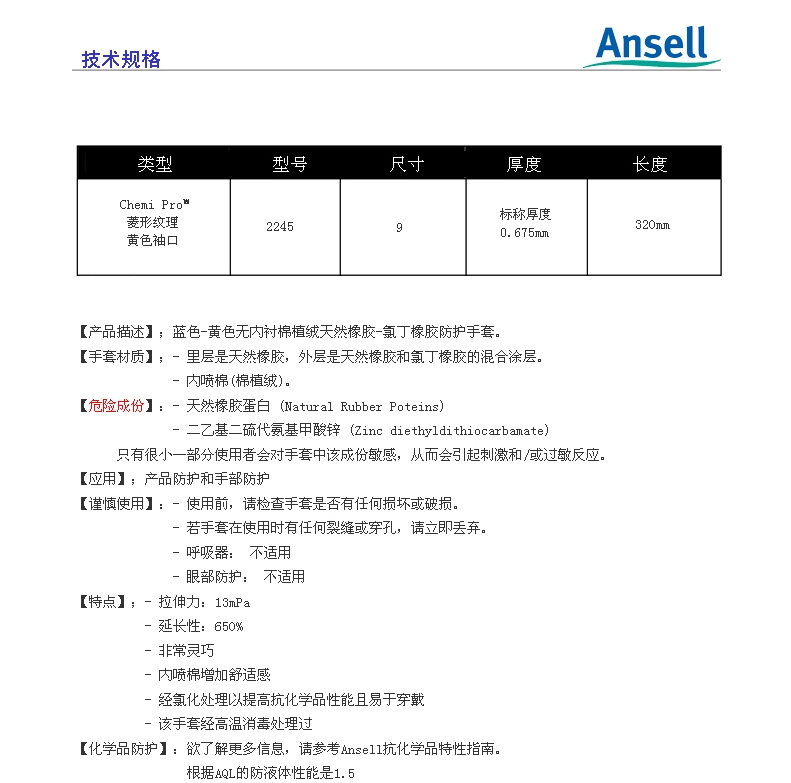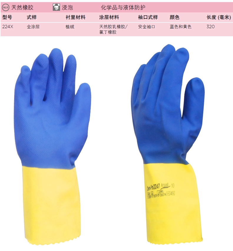 天然橡胶、氯丁橡胶25%含量,抗化学品、防滑,高品质棉植绒衬里,对盐和洗涤剂有很好的防护能力