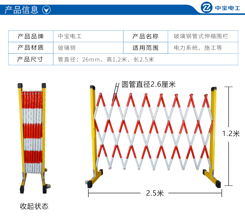 商品名称:中宝 绝缘伸缩围栏玻璃钢防护栏 施工移动伸缩2.5米安全围栏