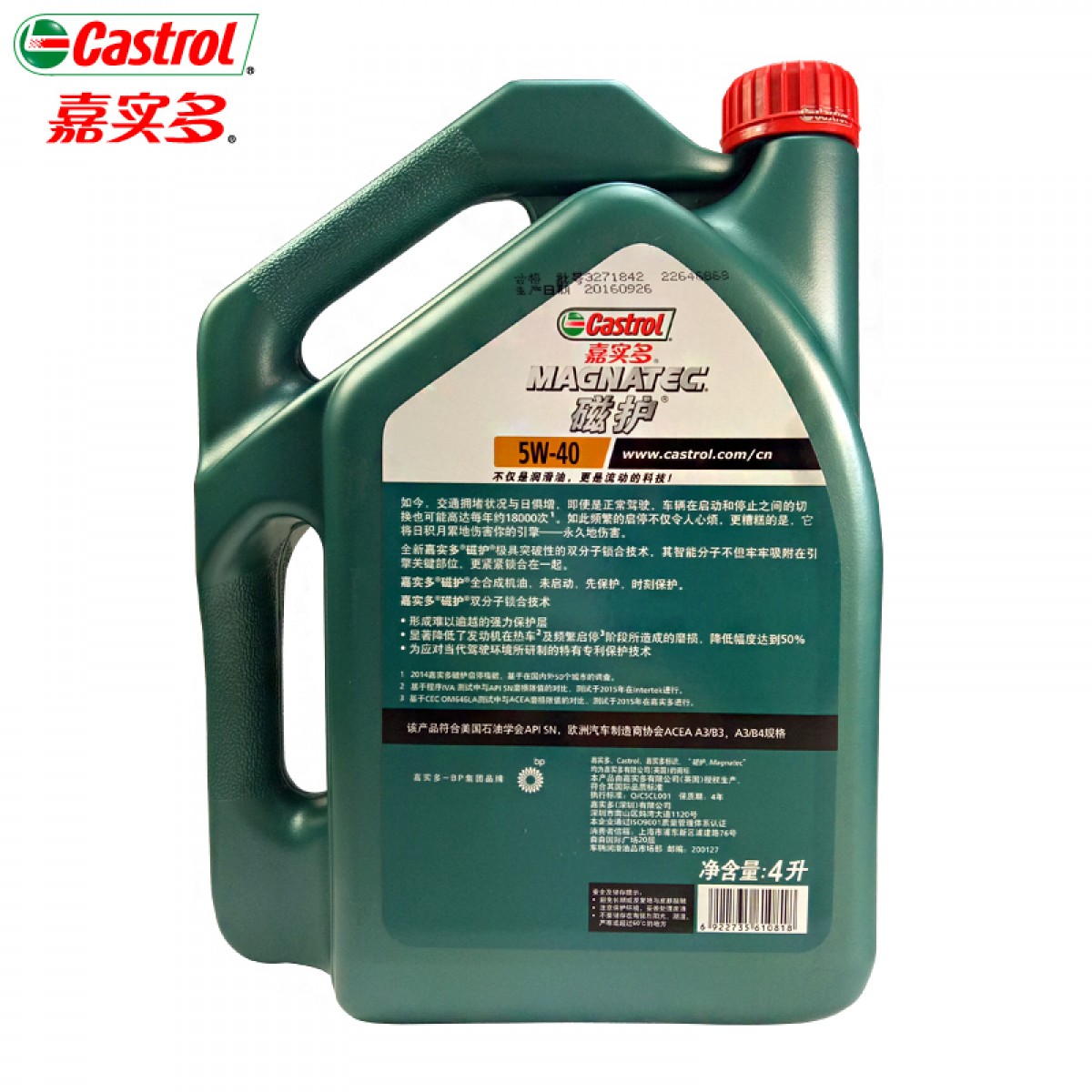 商品名称:嘉实多 磁护 全合成机油 API SN 5W-40 4Lx2瓶
