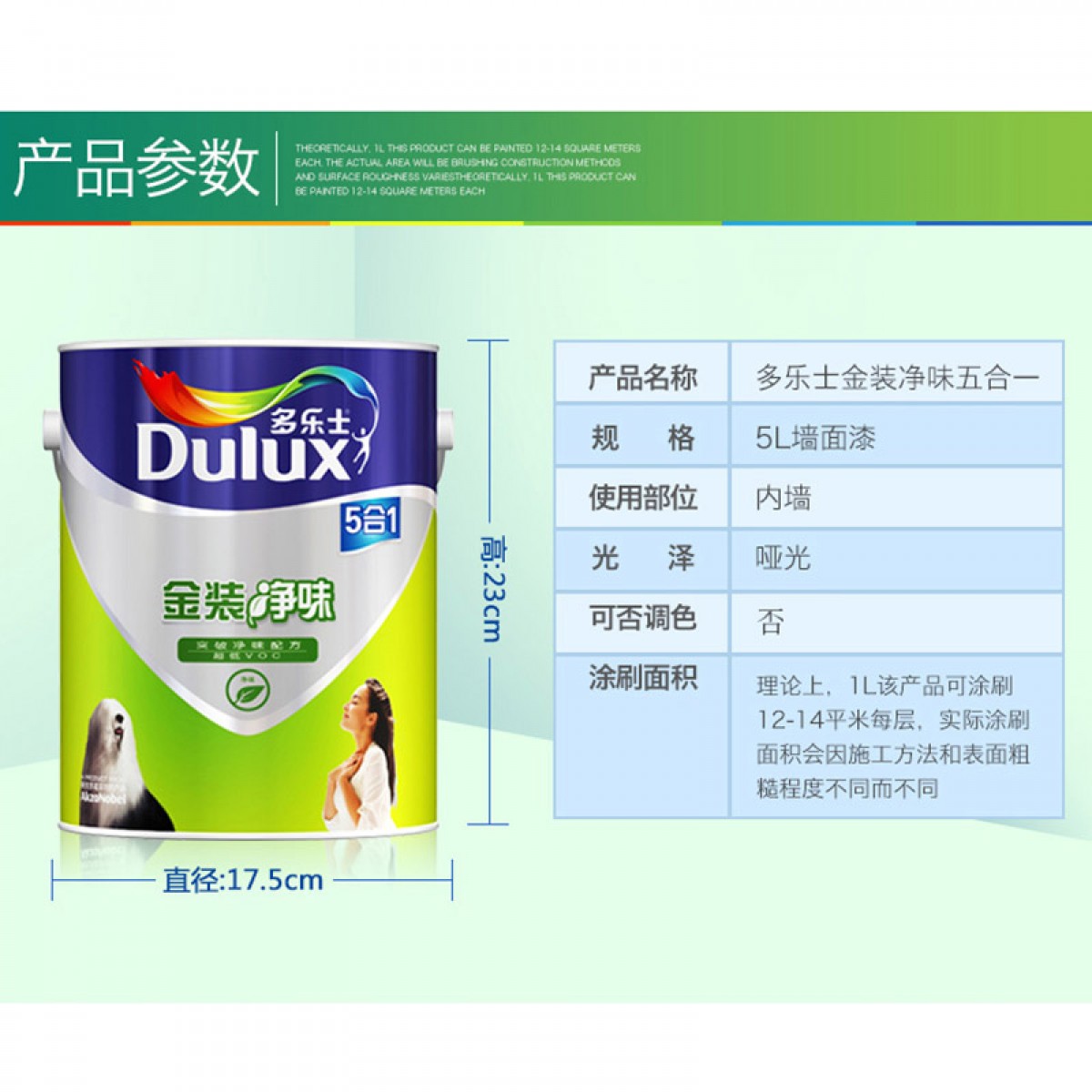 商品名称:多乐士漆 金装净味五合一超低VOC内墙漆乳胶漆墙面涂料漆 ICI0050