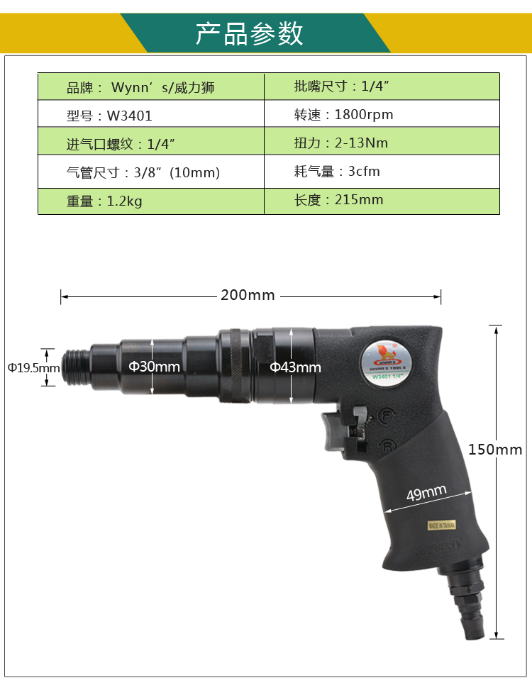 商品名称:Wynn's/威力狮 1/4离合式扭力风批 气动螺丝刀 风动螺丝刀枪式 W3401
