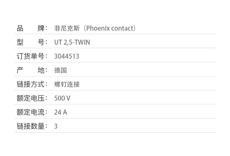 商品名称:菲尼克斯 接线端子螺钉连接2.5平方 UT 2.5-TWIN-3044513