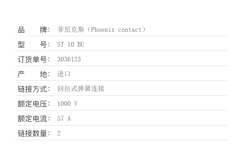 商品名称:菲尼克斯 接线端子回拉式弹簧连接10 平方 ST 10 BU-3036123