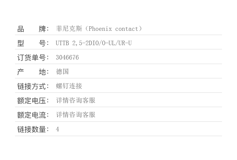 商品名称:菲尼克斯 端子螺钉连接2.5平方 UTTB 2.5-2DIO/O-UL/UR-UL-3046676