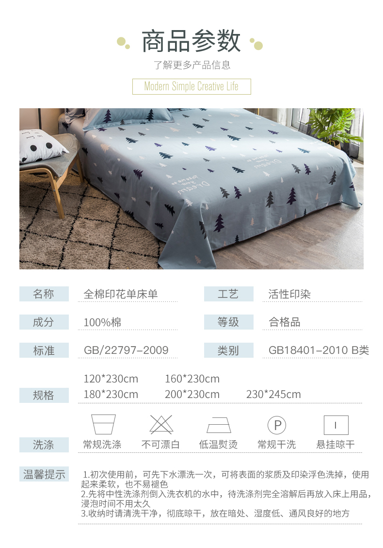 商品名称:国产 全棉床单单件纯棉单人床1.2m/1.5m
