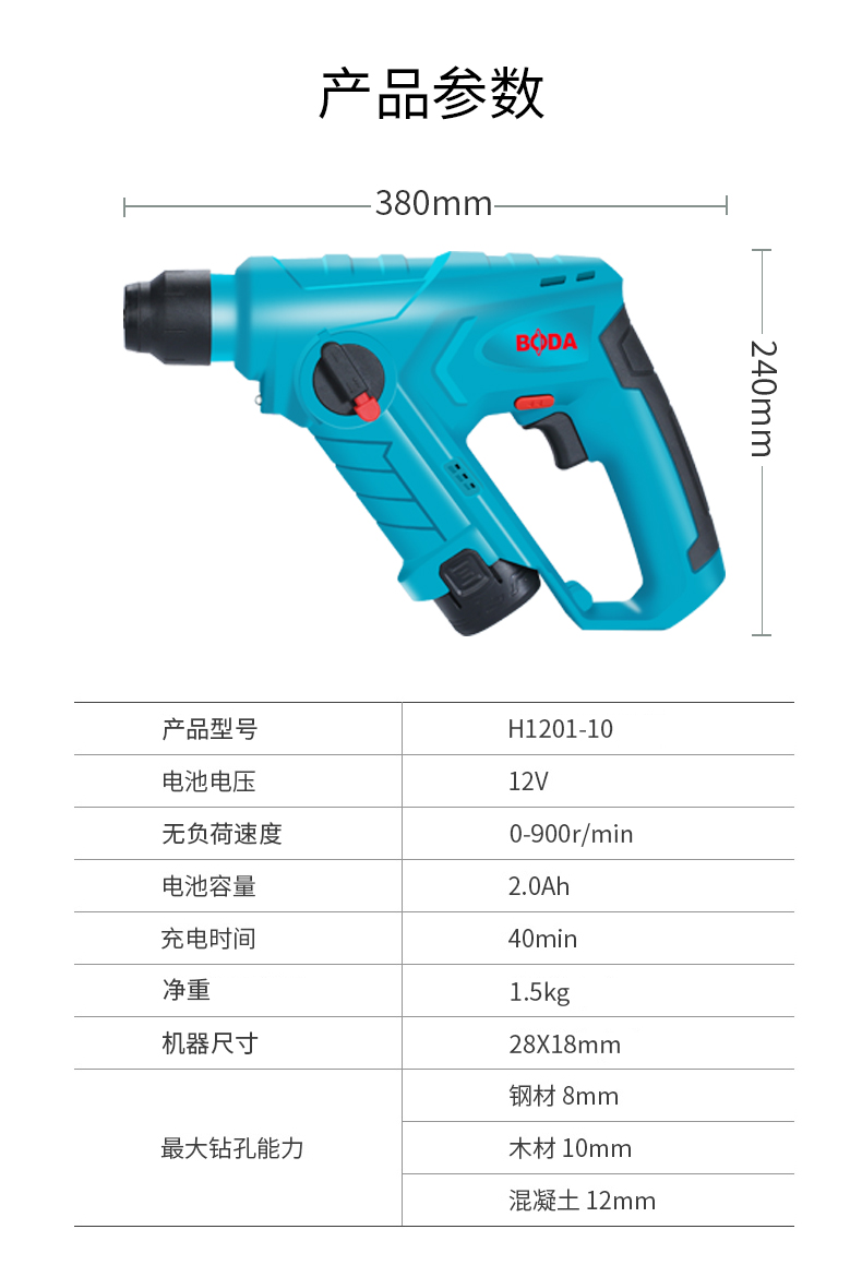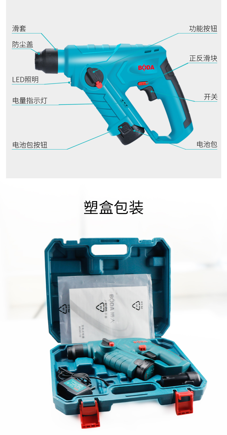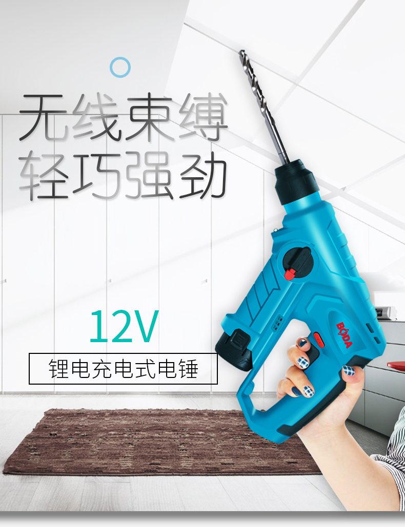 商品名称:博大 充电小锂电锤电钻家用多功能无线锂电轻锤冲击钻打混凝土装修 H1201-10