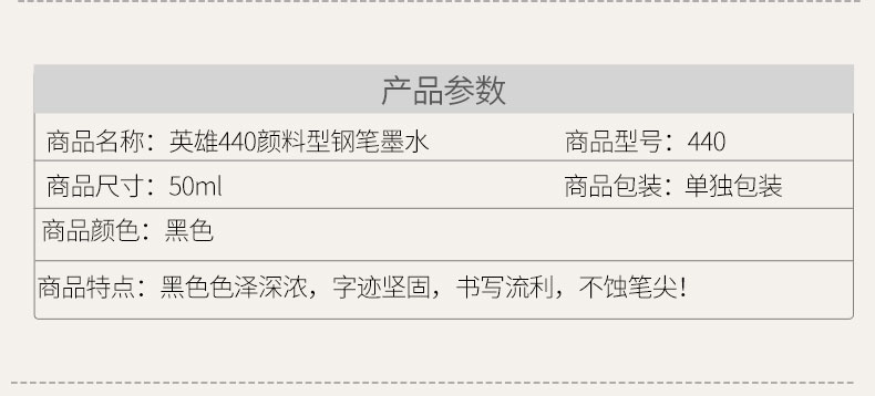 商品名称:英雄 440钢笔墨水非碳素颜料型品质 不堵笔学生用50ml
