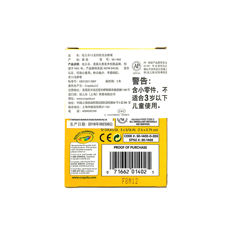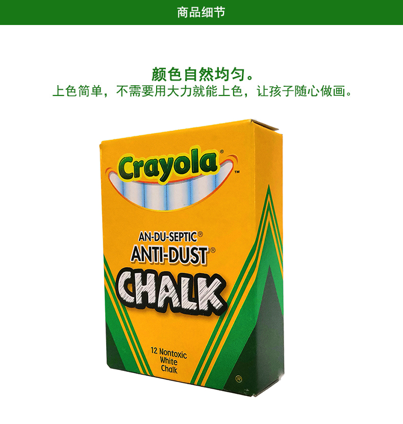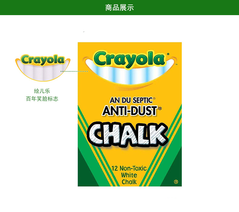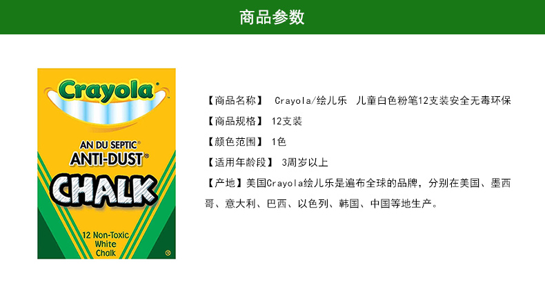 商品名称:绘儿乐/crayola 白色粉笔12支儿童用安全粉笔粉尘小安全益智51-1402