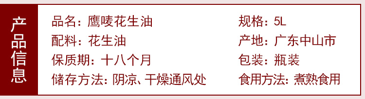 商品名称:鹰唛 浓香花生油5L升正宗纯正一级压榨桶装天然商用农家广东食用油