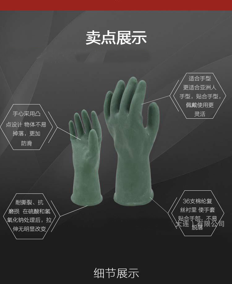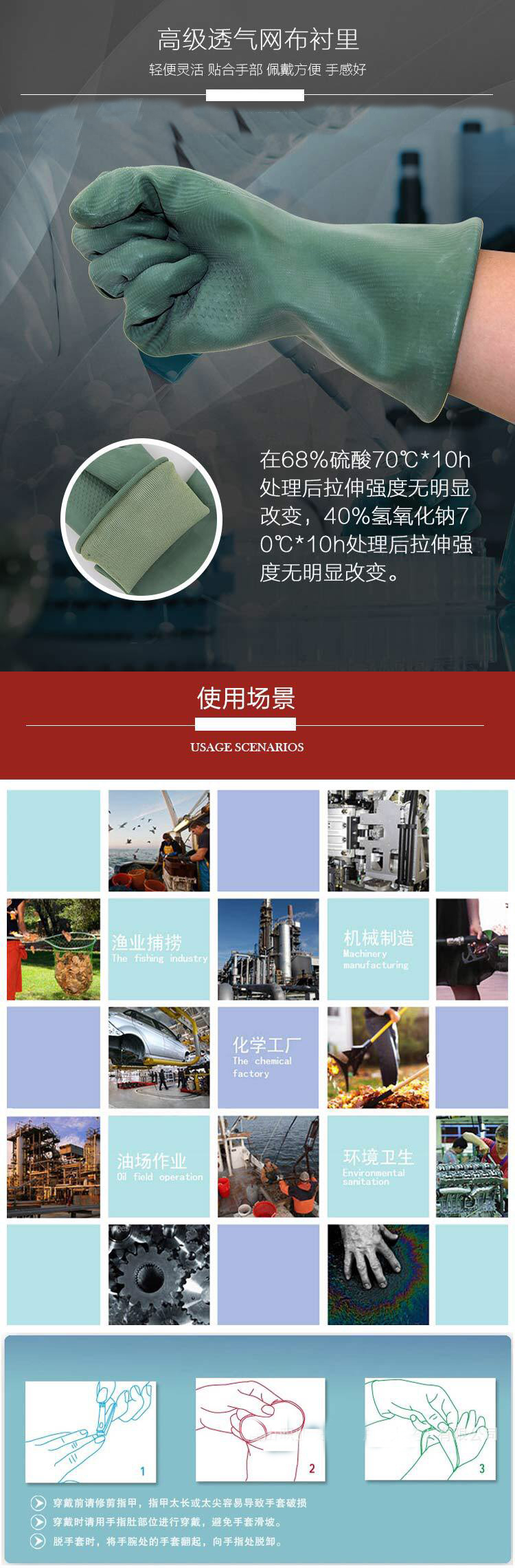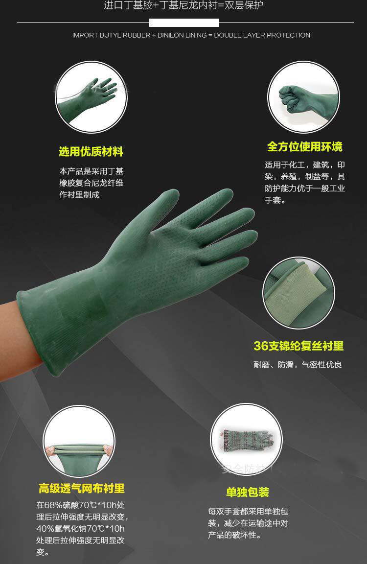 丁基尼龙衬里工业手套被广泛应用于化工、建筑、电镀、印染、漂染、水产、制盐、辐照等行业。