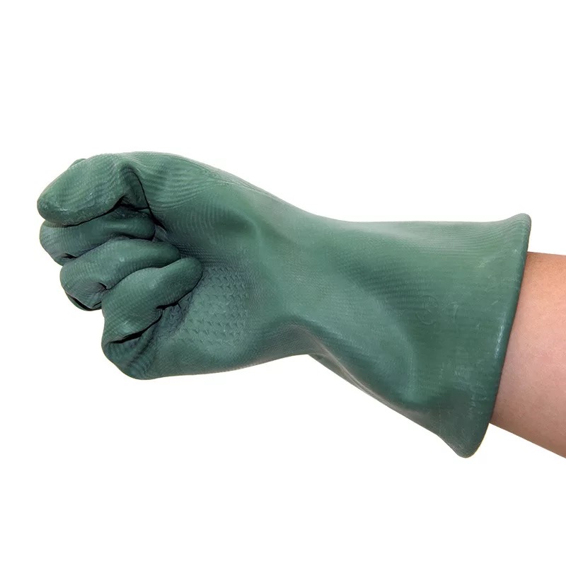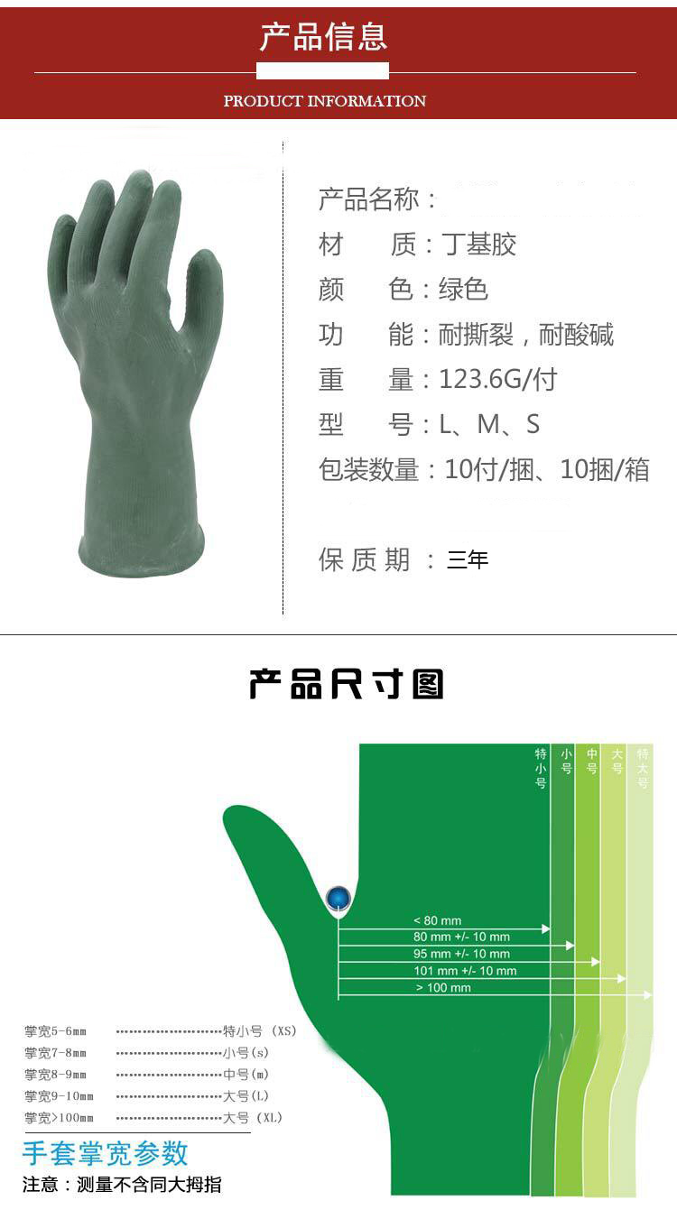 丁基尼龙衬里工业手套是以丁基胶乳为主要原料,并以尼龙纤维为衬里复合制成的工业用手套。手套的主要材料丁基橡胶透气率低,气密性优异,耐热、耐臭氧、耐磨耐老化性能良好。其防护能力和耐用性远优于天然橡胶手套。