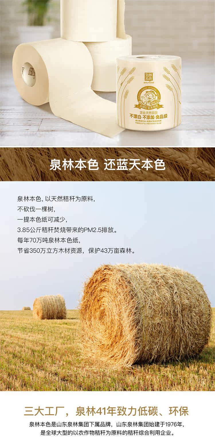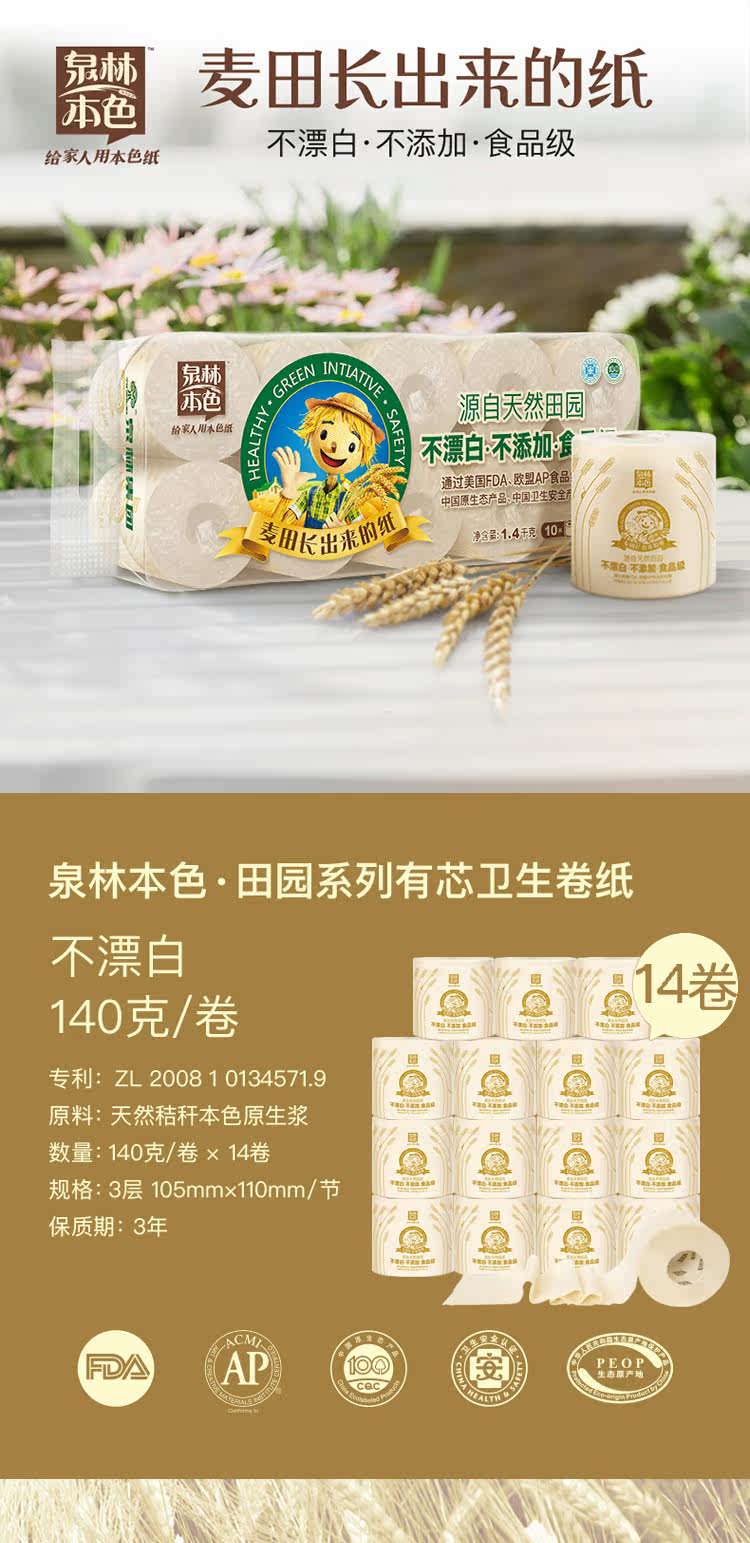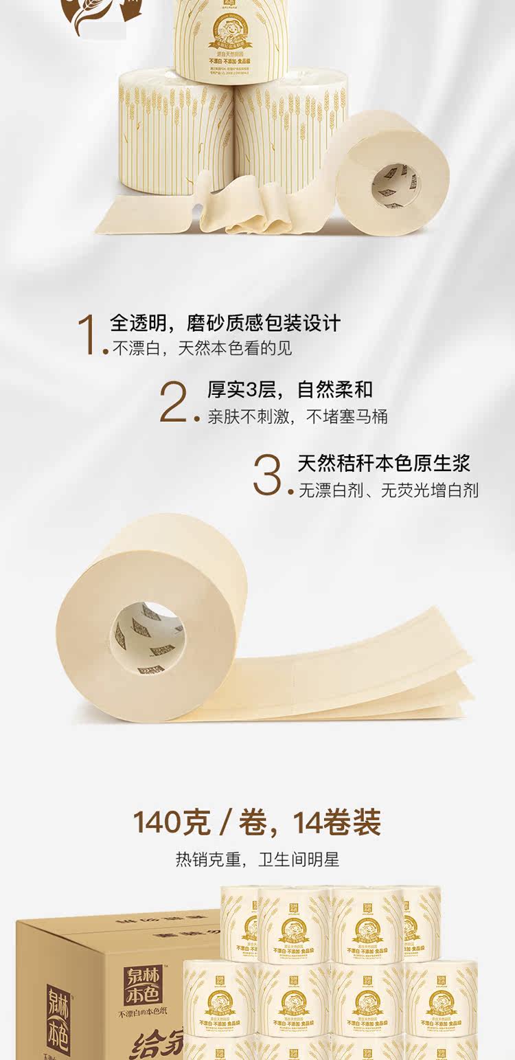 商品名称:泉林本色 无漂白三层卫生卷纸厕纸小麦秸秆140克*14卷箱装