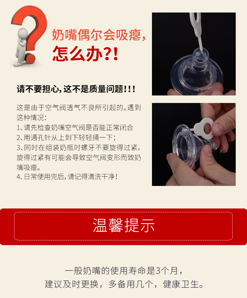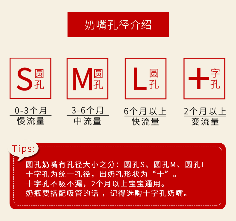 规格:圆孔S(0-3个月) 圆孔M(3-6个月) 圆孔L(6个月+) 十字孔(2个月以上通用)