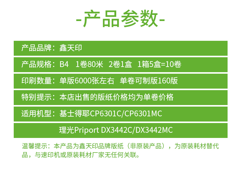 商品名称:鑫天印 适用基士得耶Gestetner CP6301C速印机版纸6301MC一体机蜡纸理光priport DX3442C版纸3442MC数码印刷机